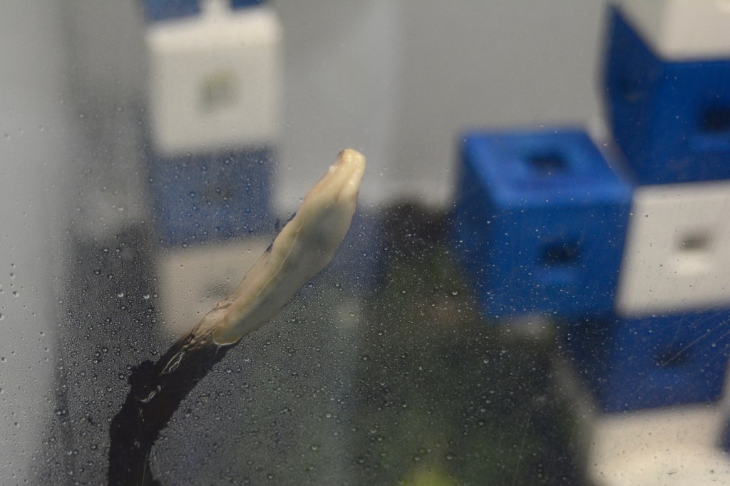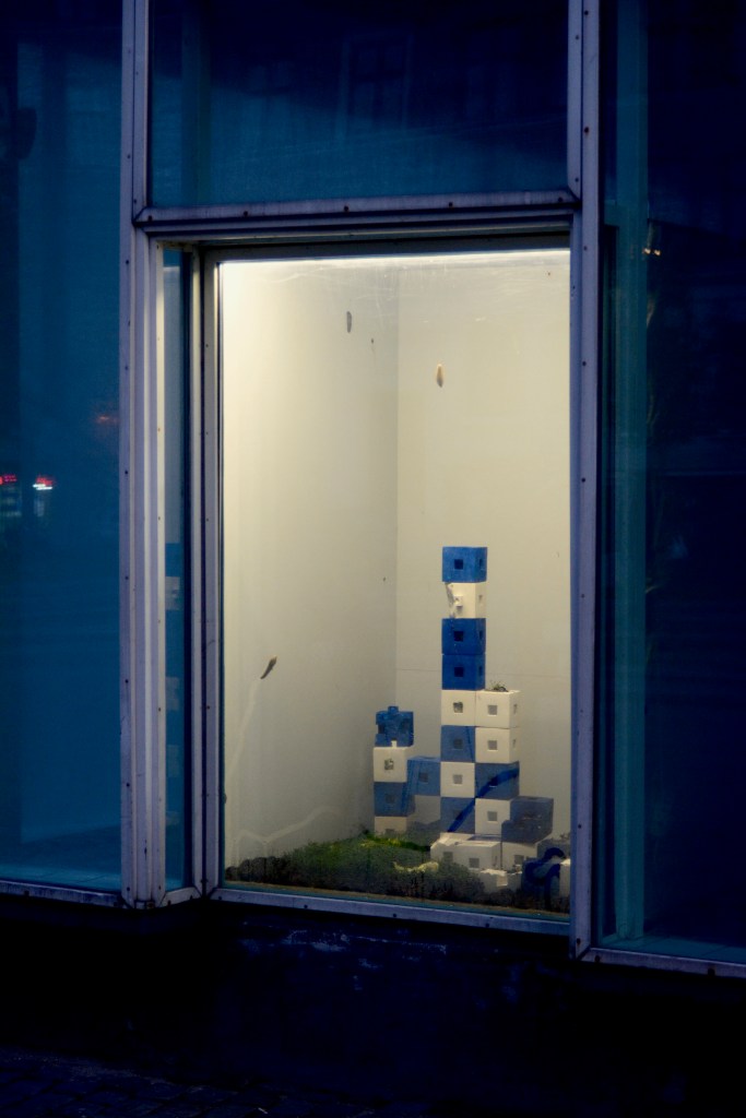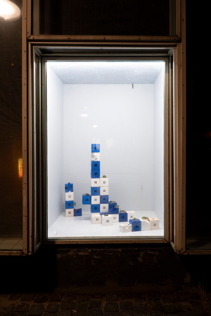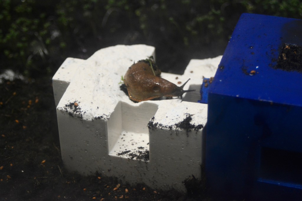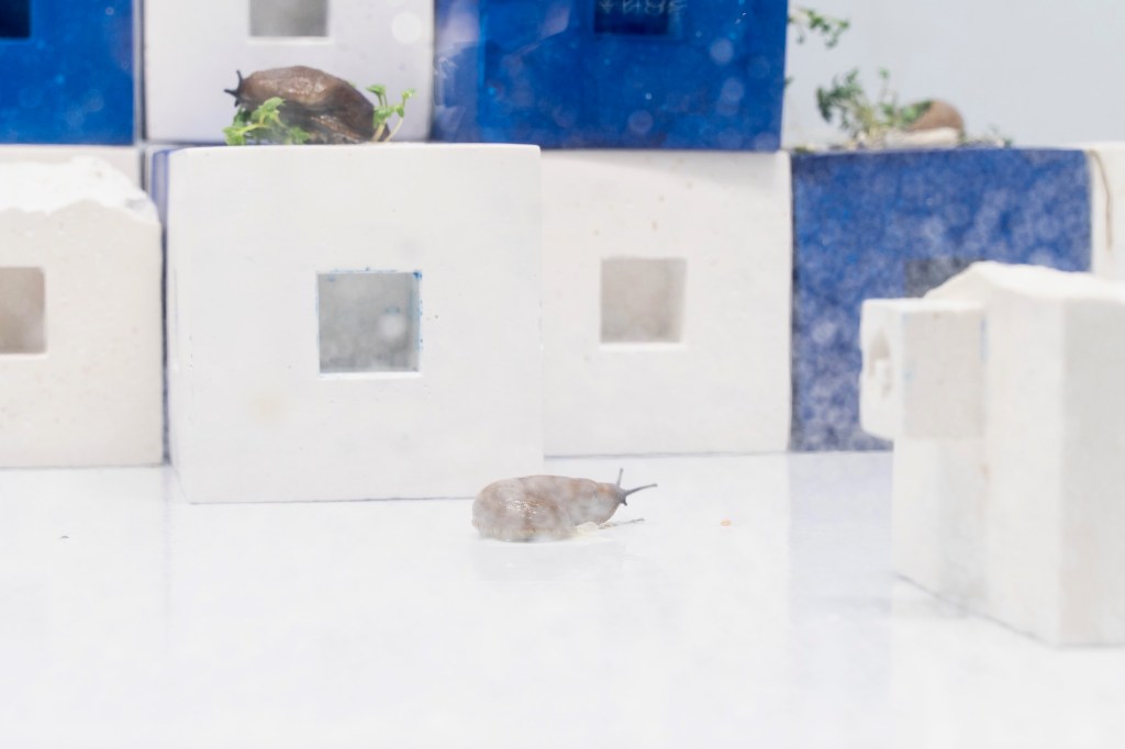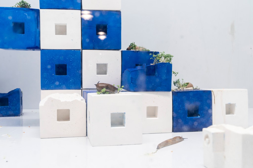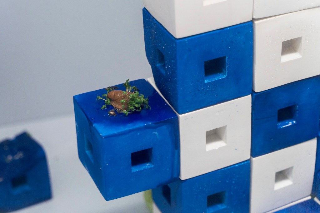 unwillingness to see. Measures against Mass consists of two parts. The first being a sculpture build of enlarged centicubes casted in jesmonite. The cubes are inhabited by slugs marking their traces with resistant slime. These Spanish slugs, existing whether we see them or not, remind us of a non-constructed world ignorant to human dominance. This slimy, hermaphroditic, boneless, excrement-eating creature is a concentrate of what we do not like welcoming into our culture. But the more control man has taken over the environment, the more uncontrollable the environment seems to react. Yet the Spanish slug and the centicube have something in common.